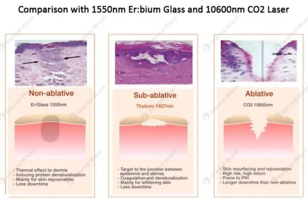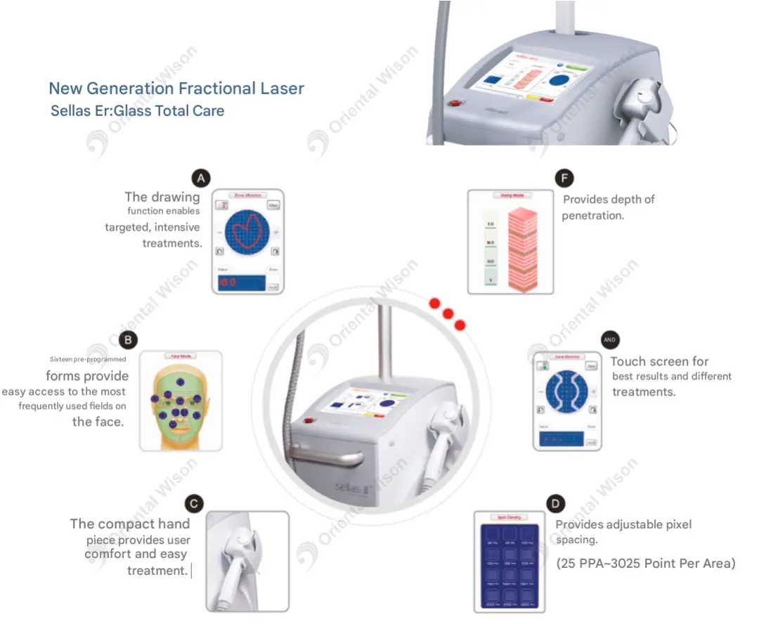 Det är ett icke-invasivt Er: glaslasersystem med en våglängd på 1550nm. Våglängden på 1550nm applicerar termiska pulser djupt in i derma genom epidermis, där de absorberas av vattnet i vävnaden och leder till hög temperatur inuti vävnaden. Vävnaden värms upp försiktigt och resulterar i nedbrytning av celler, medan hudytan är oskadad.