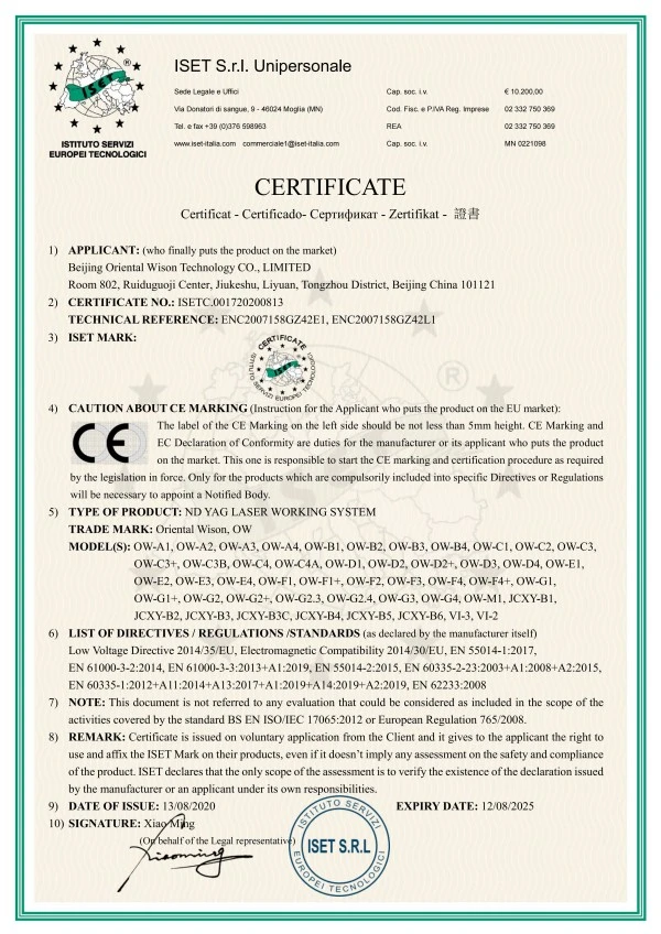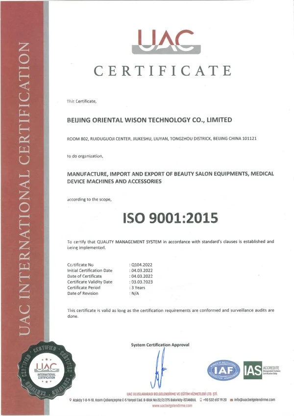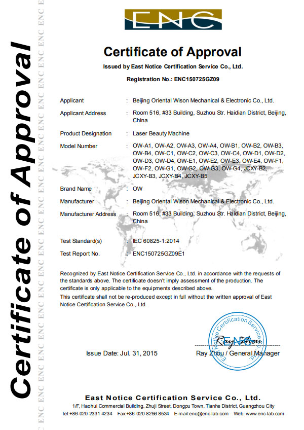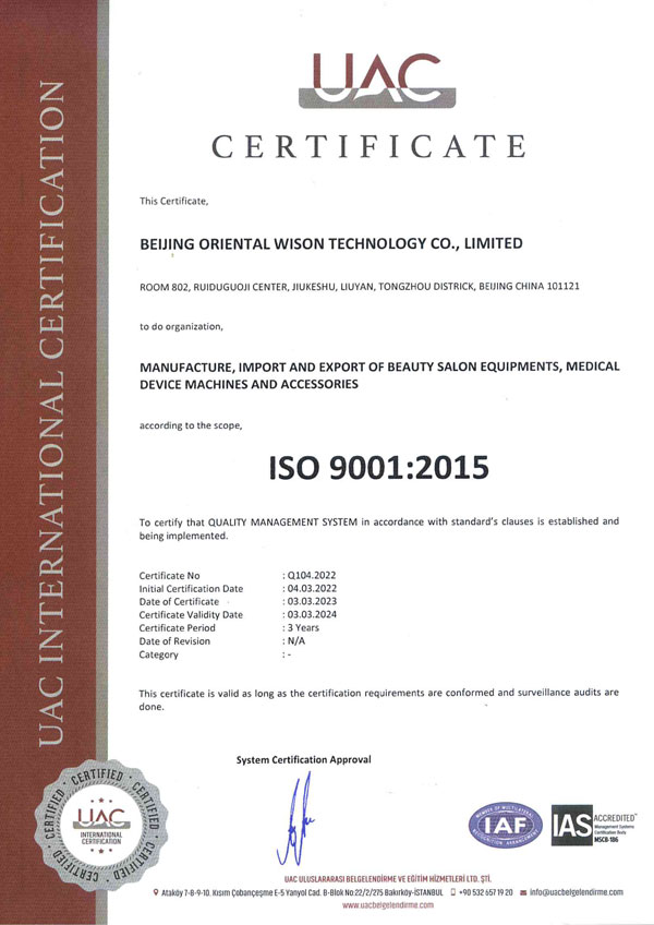 Beijing Oriental Wison Technology Co., LIMITED har varit engagerad inom skönhetsutrustning sedan 2002. Vi har fått ett mycket gott rykte över hela världen. Vi integrerar på forskning, utveckling, tillverkning, utbildning, försäljning av skönhetsmaskiner för skönhetslaser. Vår produktlinje täcker Erbium yag laser, Alexandrite laser, diod laser, IPL Laser, ND YAG laser, 10600nm fraktionerad laser, RF mikronål, EMS maskiner. Vi kommer också att tillhandahålla OEM-service kraftfulla distributörer från olika länder. Vi har erhållit europeiskt CE-läkarintyg, ISO13485: 2008 och ISO9001: 2008 internationella kvalitetskontrollsystemcertifikat.