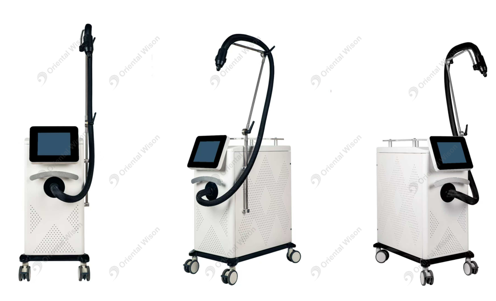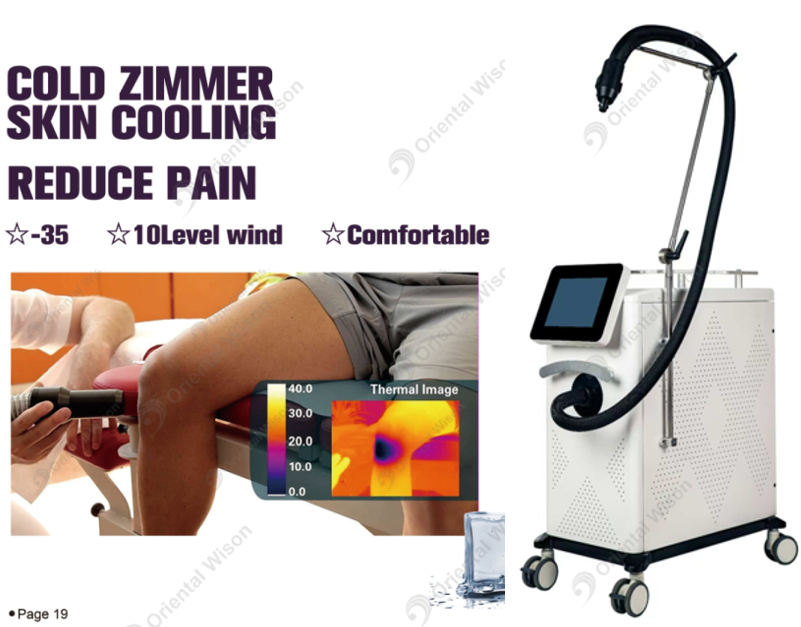 Arbetsprincip:HudkylningsmaskinAnvänder den mest avancerade kyltekniken, det interna kylsystemet intagar luft direkt och avgasar kall luft vid rätt temperatur som sprayer på patientens behandlingsområden för att kyla huden och förhindra att huden brännas